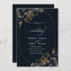 Navy Blue Flowers Gold Leaves Frame Wedding Invitation