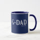 G-Dad coffee mug design with established year featuring a white stamped font set on a Navy Blue background. Click customise to edit the background colour!. Visit our shop to view this mug in a large assortment of grandfather names.