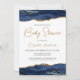 This trendy baby shower invitation features a top and bottom border of watercolor agate geode in shades of navy blue with faux gold glitter highlights. The words "Baby Shower" and the name of the mum-to-be appear in gold-coloured handwriting font. Add the party details in charcoal grey on a white background. A matching navy blue and gold agate image appears on the reverse side.
