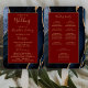 This elegant, modern wedding program fan features a navy blue agate background trimmed with gold faux glitter. The text appears in elegant gold-coloured handwriting and copperplate fonts on a burgundy red rectangle.