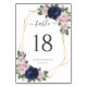 Elegant navy blue and blush floral wedding table numbers featuring a gold geometric frame surrounded by blue and blush roses and greenery. Matching items available.