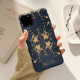 An elegant and navy blue and gold phone case design, with an abstract celestial pattern, and a section for you to personalise with your name or initials on the bottom.