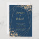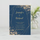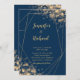 Our stunning navy blue wedding invitation featuring accents of champagne-hued bokeh lights is sure to wow your guests. The geometric gold frame brings elegance to this modern invite shimmering with bokeh sparkles.