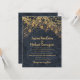 Elegant wedding invitation with beautiful glittery gold string lights and sparkling bokeh on a bold navy blue background.