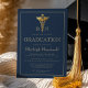 This classic, elegant graduation party invitation design features a gold-coloured caduceus flanked by two editable letters (for example, RN for Registered Nurse) on a navy blue background. Personalise the text with the graduate's name, school and year, along with the party details. A thin, gold-coloured rectangular border frames the design. The back of the card is solid navy blue,