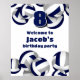 This volleyball themed birthday party welcome poster is fully customizable and features randomly arranged navy blue, gray and white volleyballs, upon which you can personalize your custom message and the child's age, or customize the text to suit your event - by katz_d_zynes