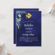 A navy blue background, decorated with greenery. The blue colour is uneven. Personalise and add a name and party details.
