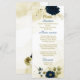 Beautiful navy blue ivory white and gold flowers with pretty leaves wedding menu.