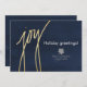 Include your logo on the front and special message on the back of this classy corporate business Christmas or Holiday card, Joy in bright gold script lettering, Modern, elegant navy blue watercolor background with gold effect fancy script text. Stylish flat greeting card. Design Copyright © CustomChristmasPhotoCards.com
