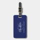 Navy blue faux leather print as background. Personalise and add your first name, monogram letters and full name on the front. Your contact information on the back. White and blue text.