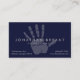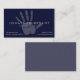 Two tone navy blue handprint design massage therapist business card. Business card text is printed in light grey ink but can be changed to colour of your choice by using the customise it feature. Simply type in your information using the template.