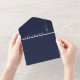 This all-in-one minimalist wedding invitation features modern typography on a navy blue background. The invitation includes a perforated RSVP card with your wedding website QR code. Designed by Thisisnotme©