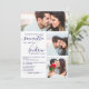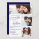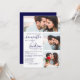 Modern minimalist navy blue script wedding with 3 photo grid collage.