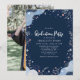 Celebrate your graduate's big day with this chic and stylish invitation! The design features a modern, abstract arrangement of flowers, leaves, and playful confetti dots on a deep navy background. A dedicated space on the back allows you to showcase a favourite photo. Personalise this template with their name, date, time, location and RSVP details.