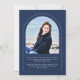 This navy blue simple minimalist arch graduation announcement features a delicate arch frame, 2 photo templates and elegant modern typography.