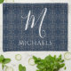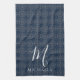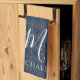 This design features a navy blue kitchen towel, perfect for holiday baking, a monogram script, a hostess keepsake, a handwritten initial, a cute simple, elegant rustic, festive snowflake design, with a monogrammed letter, minimalist design.