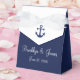 Navy blue nautical wedding favour boxes (tent favour box with white ribbon) with anchor and customisable text - you can add bride's and groom's name and wedding date.