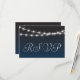 An elegant modern Wedding RSVP Response Card in a navy blue watercolor ombre effect with faint brush strokes. To the top of the co-ordinating card are two strings of sparkling string lights with the background serving as a faux night sky.