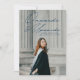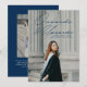 Modern graduation announcement featuring the graduate's vertical photo with "Onwards and Upwards" in a navy blue handwritten script. Personalize the front of the photo graduation announcement by adding the graduate's name, school, and graduation year. The announcement reverses to display an additional photo with the graduate's future plans, grad party details, etc. shown below.
