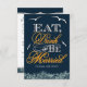 Navy Blue & Orange Nautical Wedding RSVP Cards--match the invitations and more found below on this page.Compliment your nautical wedding theme with these invitations that feature birds, ocean waves at the bottom and the new popular phrase, "Eat, Drink and Be Married." This design features a navy blue (marine) background with four white birds. The fancy lettering is a combination of orange and white colours. The bottom waves are shaded in a very light blue colouring. The back features the same dark blue background with a matching white ornamental wave frame for added flair. You can upgrade the card stock type to fancier options to the above right. Each RSVP comes with a fitted white envelope. See matching wedding invitation below for design details.