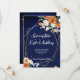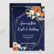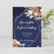 Orange and white roses sage eucalyptus greenery navy blue background gold geometrical frame floral wedding Save the Date card with QR wedding website code at the back, if not needed - delete those fields from drop down menu.