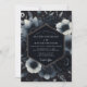 A moody aesthetic defines this design with a deep palette of navy blue and charcoal tones. Elegant white anemones contrast against lush charcoal roses and intricate foliage. Delicate gold accents provide warmth amidst the cool, nocturnal botanical scenery. The atmosphere is one of mysterious romance and sophisticated winter beauty.
