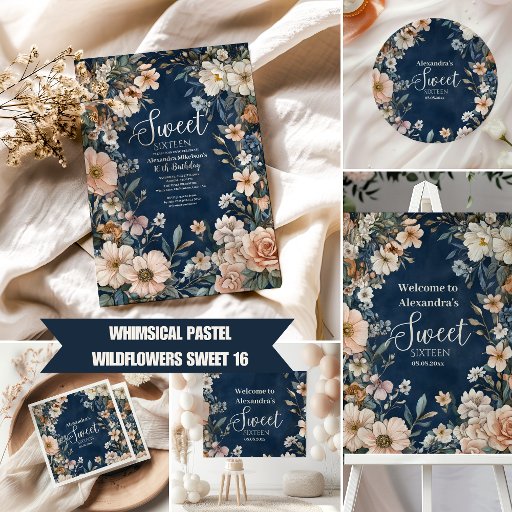 Navy Blue Pastel Wildflowers Sweet 16 Invitation