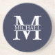 featuring personalised white monogram in classic serif font style with box of name in the middle of monogram on navy blue background.