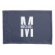featuring personalised monogram in white bold modern sans serif font style with box of name in the middle of monogram on navy blue background.