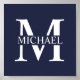 featuring personalised white monogram in classic serif font style with box of name in the middle of monogram on navy blue background.