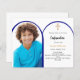 Add your own vertical size photo. A navy blue arch shaped photo frame. A white background colour. Personalise and add a name and details.
