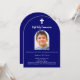 A navy blue background, decorated with a white cross Personalise and add a photo name and details. White text. Arch shaped photo frame.