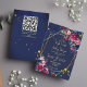 Pink burgundy roses greenery navy blue background gold geometrical frame floral wedding invitation template with QR RSVP code at the back.