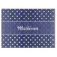 A navy blue and white polka dot pattern is the background for your name in white on a dark navy semi transparent banner. The banner is lined at top and bottom with thin white borders. Attractive, bold, and distinctive for your kitchen!