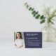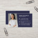 This navy blue business card features crisp white serif typography for a classic, elegant look with a modern edge. The rich blue tone appears on both sides, giving the card a clean and refined feel that works with any professional style. The front includes your photo, name, title or business name, and contact details in a polished layout that feels personal and professional. The back highlights a scannable QR code and simple social media icons with the phrase "Connect with us!" to make it easy for clients to reach you. The high-contrast design can be customized with your own colors, fonts, and details, making it a versatile choice for consultants, entrepreneurs, creatives, and anyone who wants a sophisticated, minimal card that leaves a strong impression.