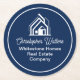 This professional realtor paper coaster is custom made with your real estate company name under the modern cursive script for an open house. This chic navy blue realty business party decor features a house logo image for home builder or realty agent company marketing.