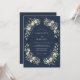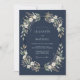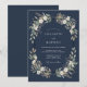A deep navy blue backdrop sets a sophisticated tone for this floral design. Delicate white blossoms and sprigs of sage green eucalyptus are arranged in a balanced composition. The cool-toned palette of indigo and silver-green creates a moody and elegant aesthetic for a formal winter event.
