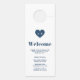 Customisable wedding door hanger featuring retro bold typography with a heart accent. This navy blue wedding door hanger is a perfect way to welcome guests. Tell your guests about the wedding activities by listing the details at the back of the door hanger. Other colours are available.