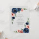 This design features a romantic arrangement of hand-painted watercolor roses and lush peonies. The deep navy blue tones contrast beautifully with soft peach and blush petals. Delicate sage green foliage adds a natural, organic feel to the composition. The artwork is set against a subtle, light grey background for a sophisticated and timeless look.