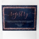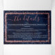 The elegant, glamourous, and modern Wedding details, gift registry, and RSVP card tri-fold bundle is perfect for the contemporary and stylish event. It features a faux printed pink rose gold sparkly glitter sprinkled confetti border on top of an artsy navy blue watercolor background. The back displays the same glitter but sprinkled across the whole page with the watercolor background. This chic, luxury, and unique design will be a hit with all of your guests! Just insert these and the included envelope (so they can send the RSVP back to you) inside your invitation envelope. Change the text and background colour by clicking on the "customise" button. Personalise the information by clicking the "details" button.