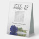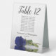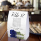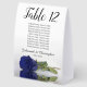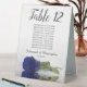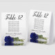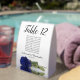 These tent table number signs are not only beautiful, they even include a list of names for the guests at each table, making it easy for your guests to find their seat at your wedding reception. The design is both elegant and romantic featuring a single navy blue coloured rose lying on its side reflecting in water with waves and ripples. The title is in lacy script calligraphy with bold numbers so your guests can easily find the right table. There is room for the names of the couple and the wedding date.