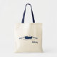 This tote bag has an illustration of a rowboat on the water in navy blue with a spot to add a name in matching blue cursive writing.