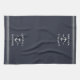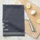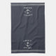 Customise your beach house kitchen with this cute personalised towel featuring your family name or house name and year established in soft ivory lettering accented with a nautical anchor illustration on a dark navy blue background.
