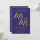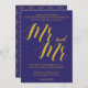 A chic rustic wedding invitation, features the "Mr and Mr" with script lettering in gold color over cobalt blue background.