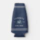 These cool personalised shore house bottle coolers feature your family name on a navy blue background, with your year established and a blue crab illustration. Rope stripe detailing at the top and bottom completes the design for a rustic nautical look.