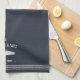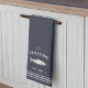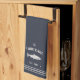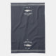 Customise your kitchen with this cute personalised towel featuring your family name or house name and year established in soft ivory lettering accented with a fish illustration on a navy blue background.