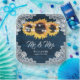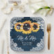 Custom navy blue rustic wedding paper plates featuring sunflowers on a barn wood background adorned with white floral lace and string lights. Matching items available to complement these navy blue rustic chic wedding paper plates inspired by sunflower flowers.