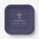 Navy Blue Script Religious Cross Boy Baptism Paper Plate