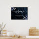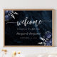 The corners of this elegant wedding poster are decorated bouquets of navy flowers trimmed with silver faux foil foliage. Customize the text in silver gray handwriting script and serif fonts on a navy blue watercolor agate background.