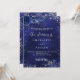 A navy blue background, decorated with faux silver glitter, sparkles and blue florals. The blue colour is uneven. Personalise and add your names and details.